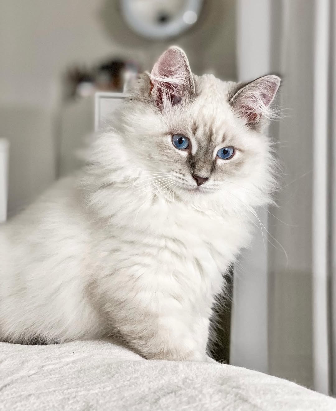 Nimbus is a stunning white Siberian male with mesmerizing blue eyes that will capture your heart instantly. His luxurious triple coat is incredibly soft and fluffy, perfect for cuddles on cold evenings. Nimbus has a calm, gentle demeanor and loves being held close.